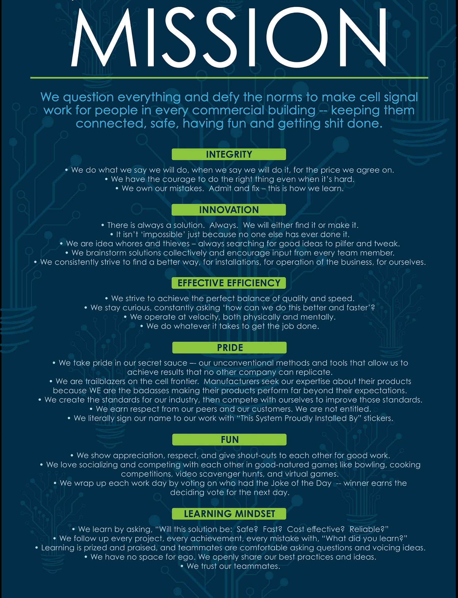 “We question everything and defy the norms to make cell service work for people in every commercial building — keeping them connected, safe, having fun and getting shit done.”