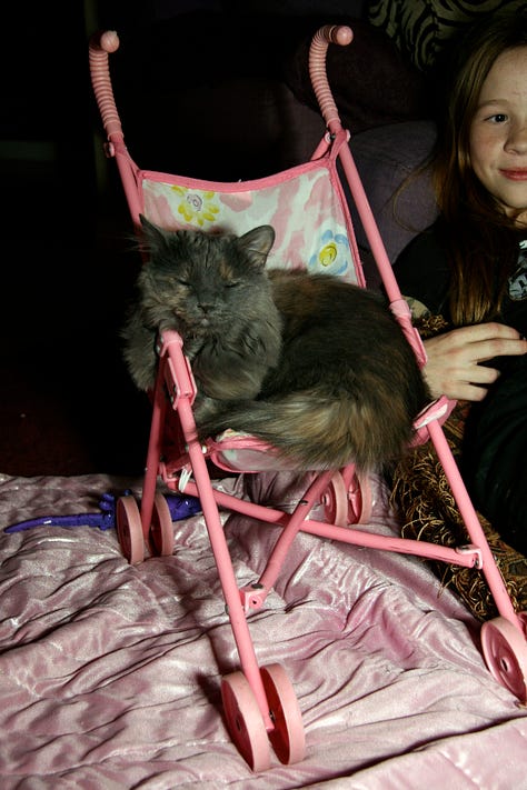 One of Sashabelle’s favorite games was to perch atop an open door, waiting untold hours for her unsuspecting prey (aka me or Adam) to walk through the doorway so that she could pounce down onto our heads, sinking every last claw into our scalps and hiss-laughing (I shit you not) while we screamed and tried to swat her off with any available defensive implement — you didn’t want to use your hands for this assignment, it just led to further injuries.
