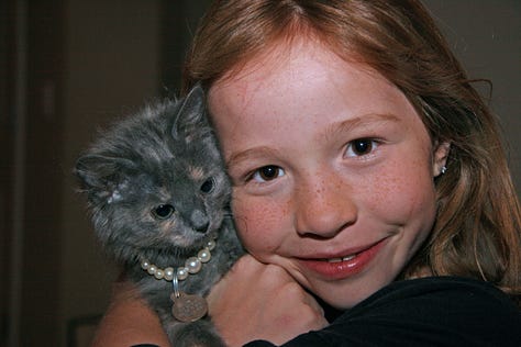 We dropped those three kittens at the shelter on the way to school and I had never seen my daughter so sad. For the rest of the day, my stomach churned and burned until I finally caved and went back to the Humane Society. When I picked the Kid up from school that day, the little gray Hell spawn who would become her dearest companion for nearly two decades greeted her from a box in the front seat. I had never seen my daughter so happy.