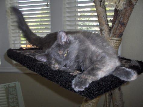 It began when our daughter, Alijah, was nine years old and she adopted a sweet, floofy, blue-grey, 3-week-old kitten. At least, she looked sweet. Little did we know, we had welcomed Satan incarnate into our lives for what would turn out to be an eighteen-year long reign of terror.